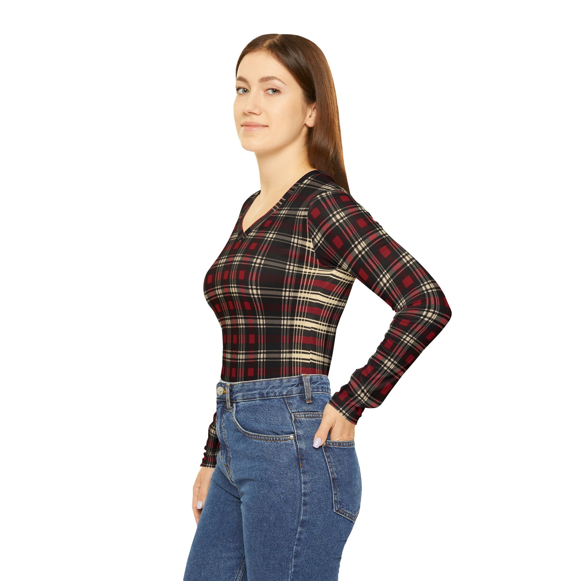 Slide into a warm, lived-in feeling with this lightweight long-sleeve V-neck finished in a timeless red-and-black tartan. The soft, stretchy knit drapes easily over layers or stands on its own, bringing a quiet, cozy confidence to everyday moments — from coffee runs to slow afternoons by the window. The plaid reads classic but relaxed, the V-neck adds a subtle feminine line, and the slim, breathable fabric keeps movement fluid whether you’re strolling the farmers’ market or curled up with a book. This shirt moves with you, holds color and structure through wear, and gives a familiar, comforting look that fits small rituals: brisk walks, low-key dinners, and holiday prep with a calm, grounded energy.