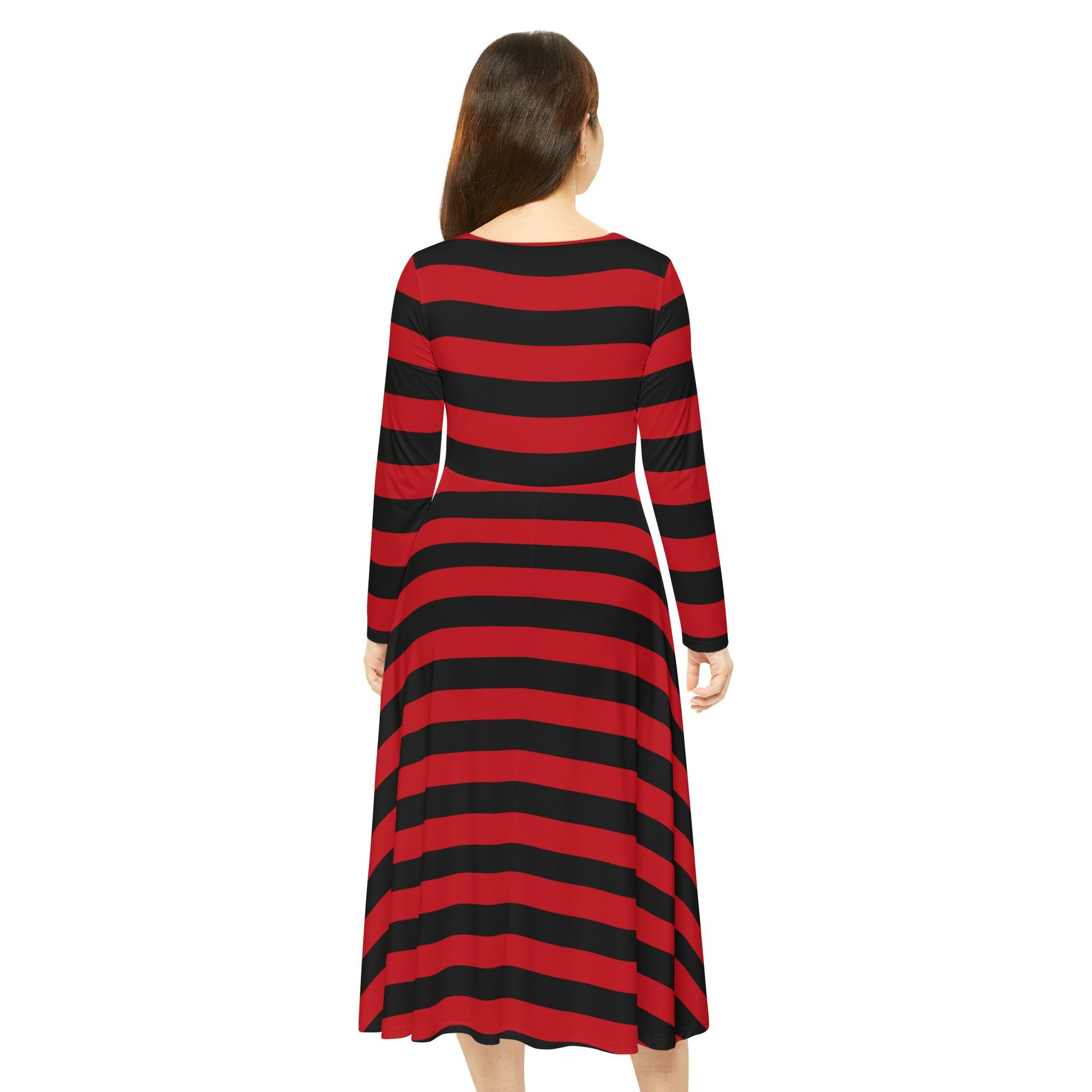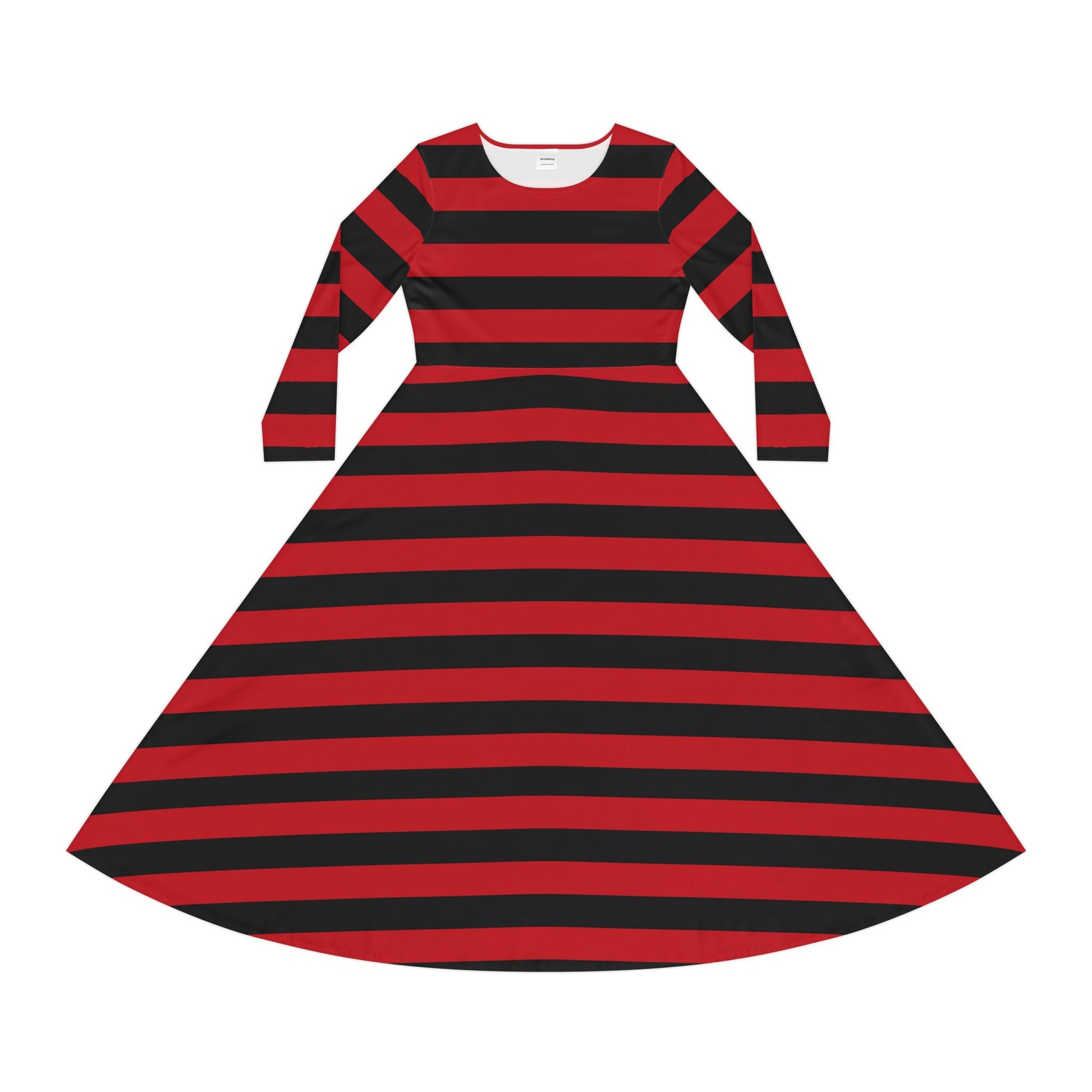 A flowing long-sleeve dress patterned in wide red and black stripes that moves with confidence. Lightweight but structured polyester gives the skirt a graceful swing while the fitted bodice and high scoop neckline keep the silhouette clean and modern. The medium-weight fabric holds bold colors that won’t fade, so the striped statement stays vivid through wear and washes. Picture slipping this on for an evening of lantern-lit streets or a lively dance night — the skirt twirls, the sleeves warm your arms, and the graphic stripes do the talking.